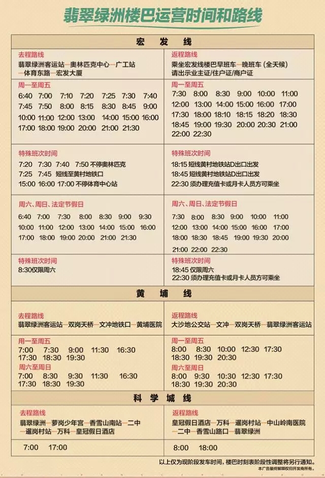 从今年2月22日起,翡翠绿洲在宏发站的楼巴将新设二楼候车厅。业主、看房客都可在宏发大厦二楼中庭取号,并在南庭候车。楼巴即将发车时,候车厅将有广播通知,乘客从5号专属通道出来即可乘车,全程无需室外等候,出行风雨无阻。