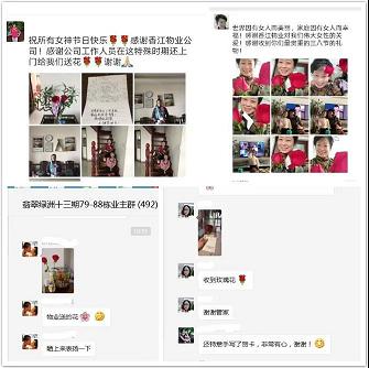 “节日里能收到物业送的花感觉很惊喜,老公都不一定会记得送花,我要发到朋友圈提醒一下他……”森林半岛某女业主收到鲜花后,一边拿起手机拍照一边调皮地开起了玩笑。物业还在园区内向业主女神主动迎上送玫瑰,并祝福“女神”节日快乐。