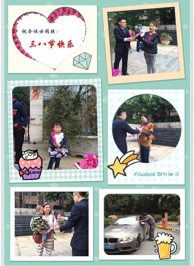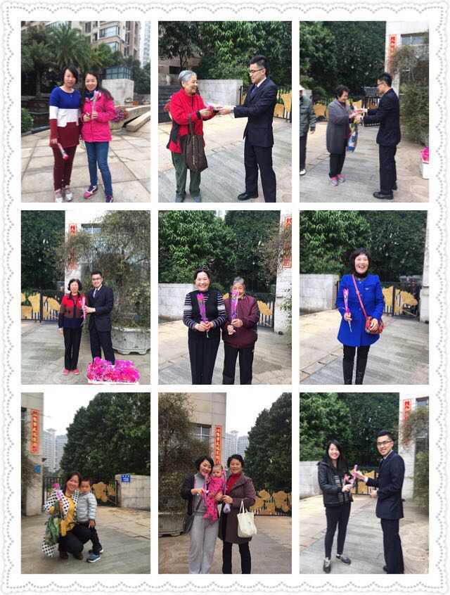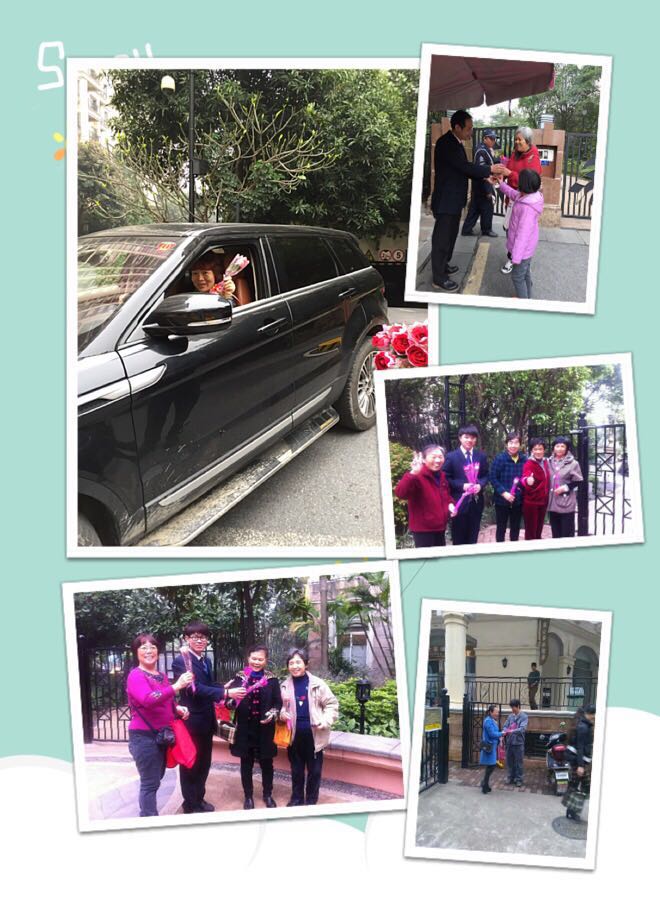 3月8日当天,锦江物业公司特安排了各部门的帅哥们手捧鲜花,站在小区各组团出入口及车库出入口,为小区女业户赠送上一支玫瑰花或康乃馨,并温馨祝福一句:“早上好,今天是三八妇女节,祝您节日快乐、身体健康”。简单而幸福的一句问候,送上了物业公司的祝福,让小区女业户感受社区暖暖的温情。每个收到鲜花和祝福的女业户脸上笑靥如花,绽放出女性的魅力和光彩。