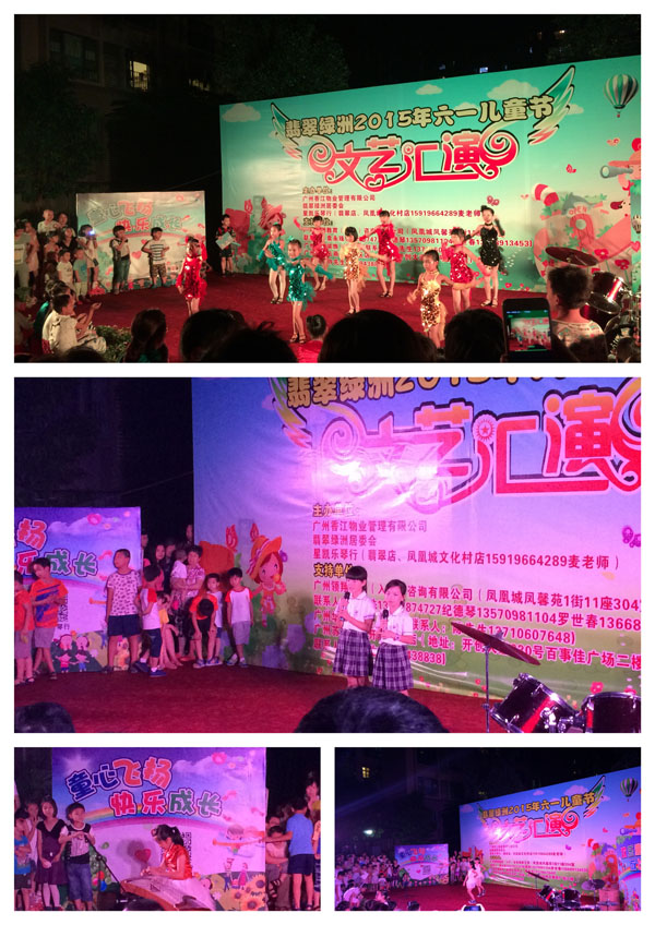 晚上7时,“2015年翡翠绿洲六一儿童节文艺汇演”拉开了帷幕,晚会上节目丰富多彩,舞蹈《梦幻拉丁》赢得了台下的阵阵掌声,古筝独奏《山丹丹开花红艳艳》回荡在园区上空,架子鼓独唱《逆战》博得大家阵阵喝彩,诗歌朗诵《我长大了》抒发了同学们对老师的感谢。一个个由小区业主自已精心编排的精彩节目轮番上演,将晚会的欢乐气氛推向了高潮。